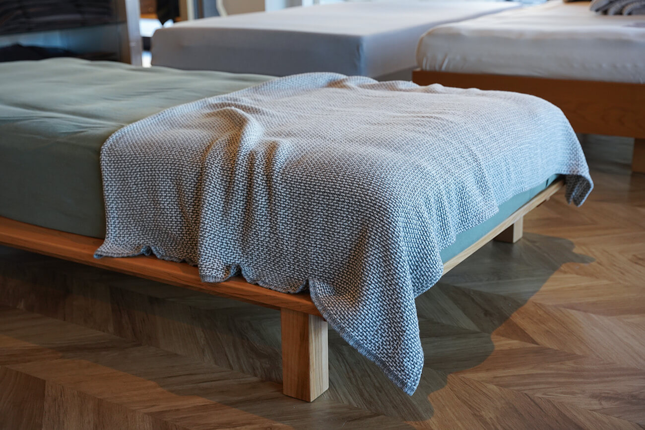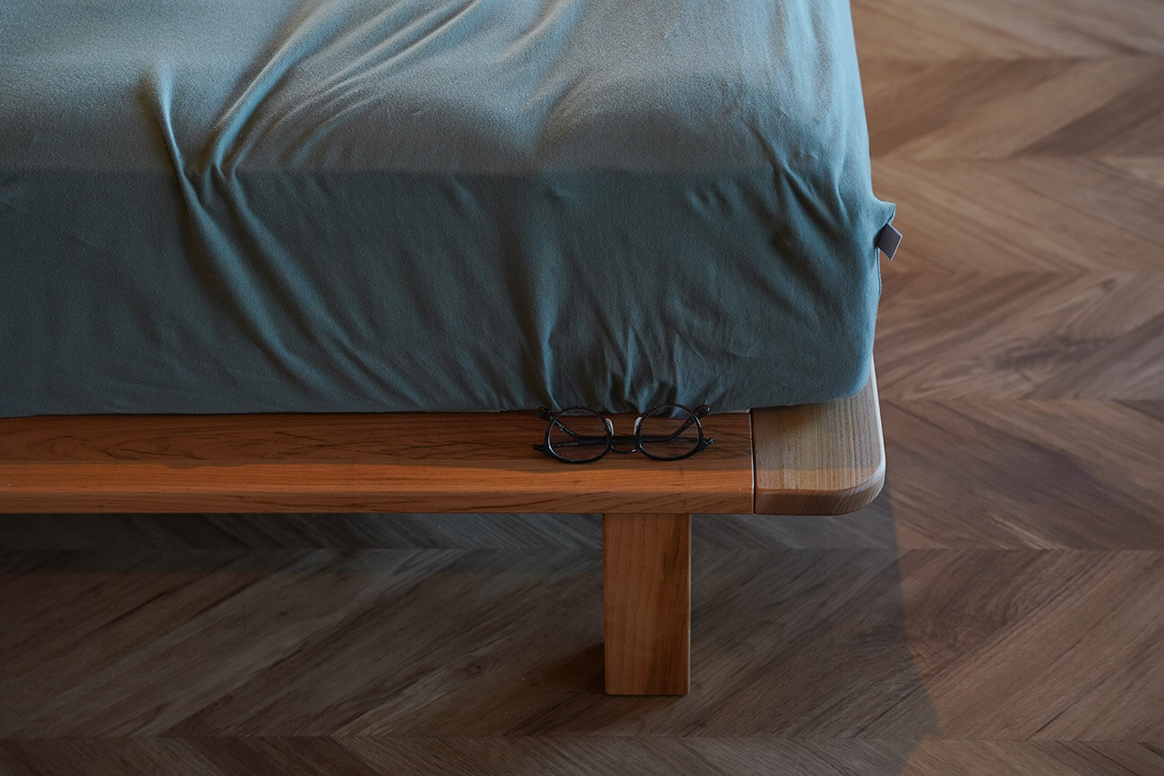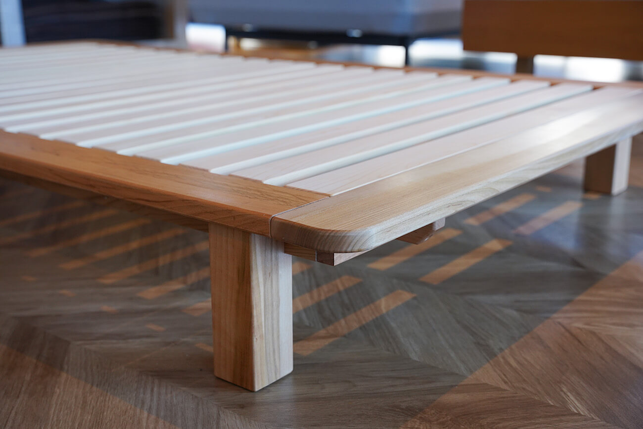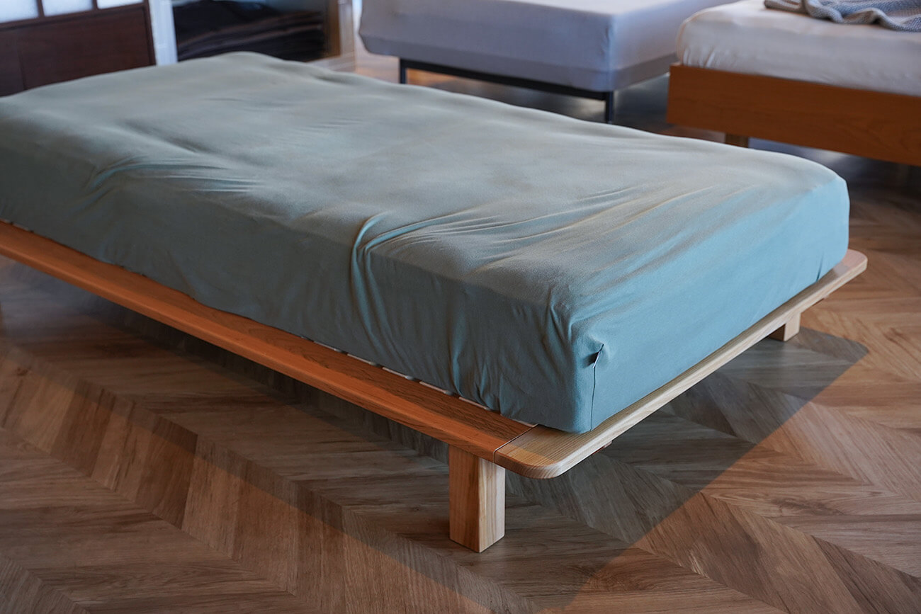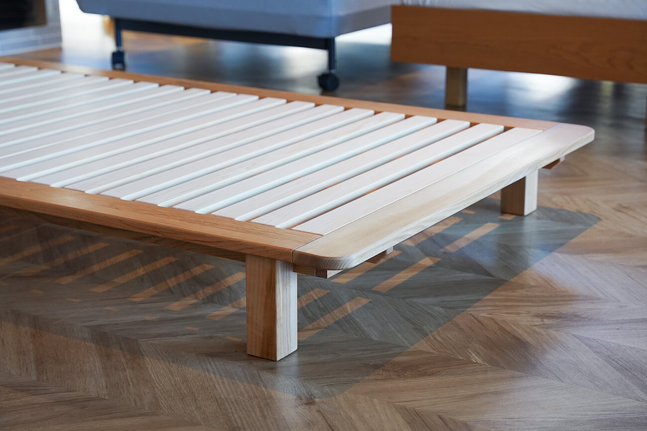 脚を付け替えれば極限までローベッド仕様にできるので、お子様といっしょに眠るファミリーやペットといっしょに眠る方たちに好評いただいております。