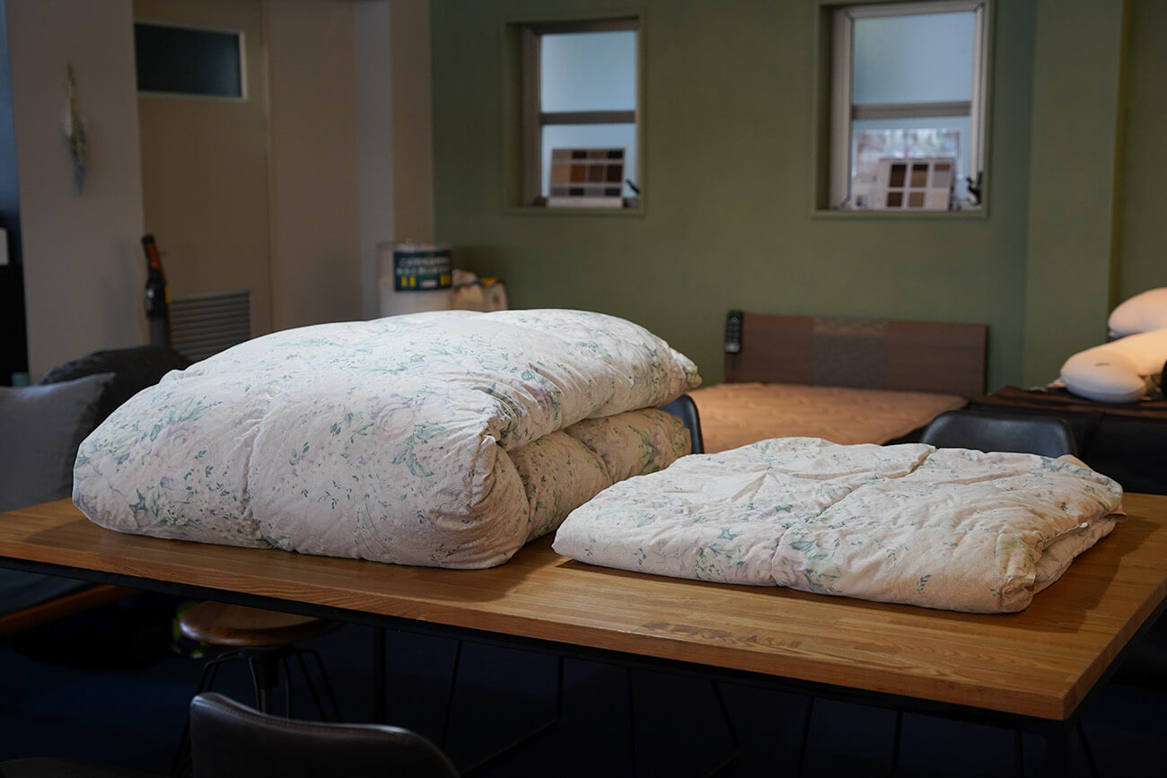 お客様の希望は「シングル2枚とダブル2枚をリフォームして、新しいシングルサイズの羽毛布団をつくりたい」ということでした。
