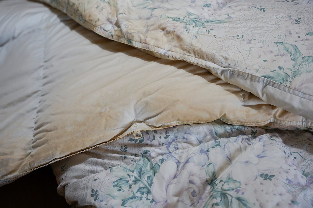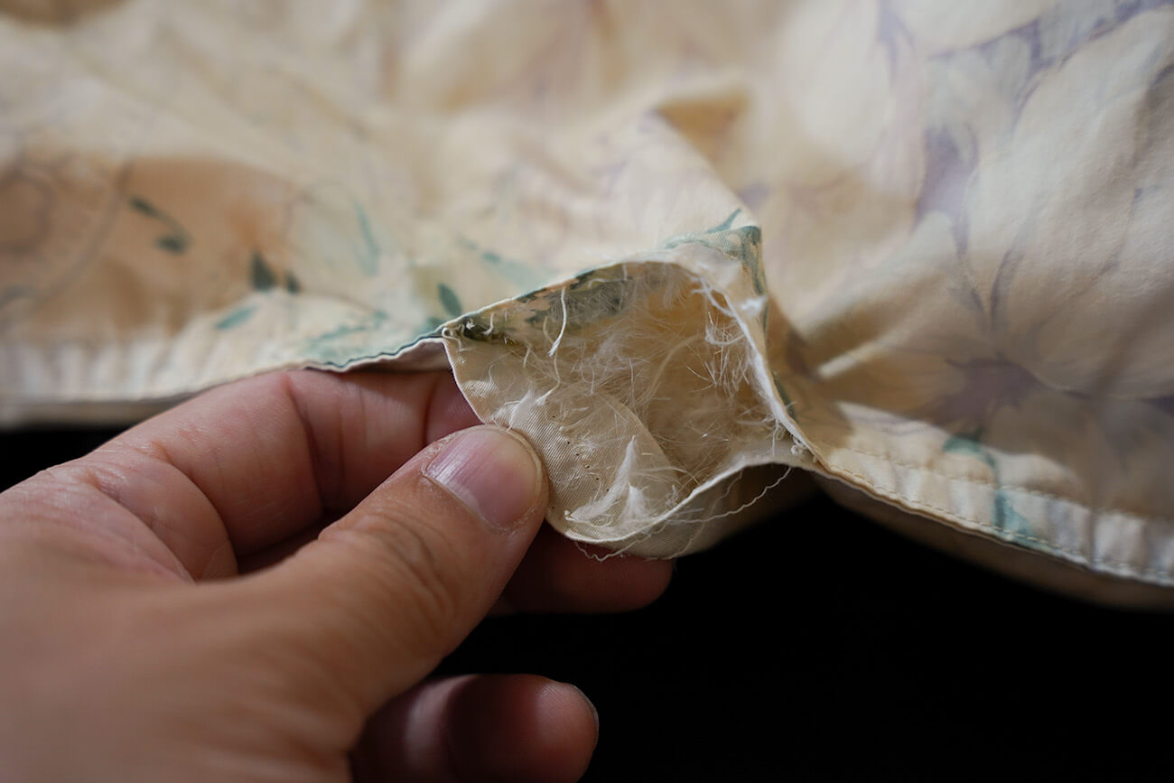 汗や湿気、皮脂といったものが染み込んでいくとシミになって除去することが難しくなります。シミになったところはだんだんと破れやすくなってくるため、羽毛やホコリの吹き出しにも注意が必要です。