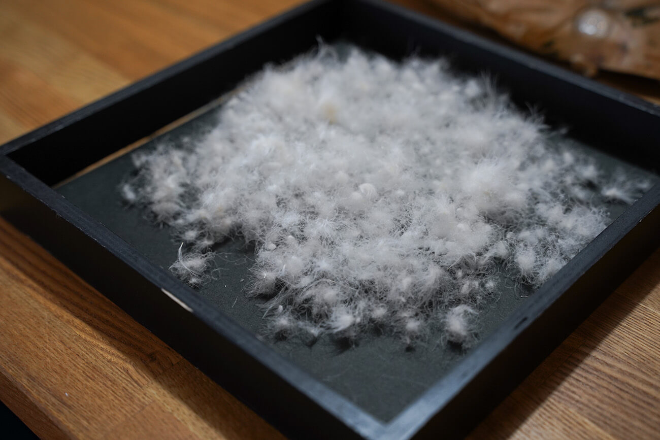 生地を開いて取り出した羽毛がこちら。ふわふわとした見た目、そしてホワイト色が確認できます。
