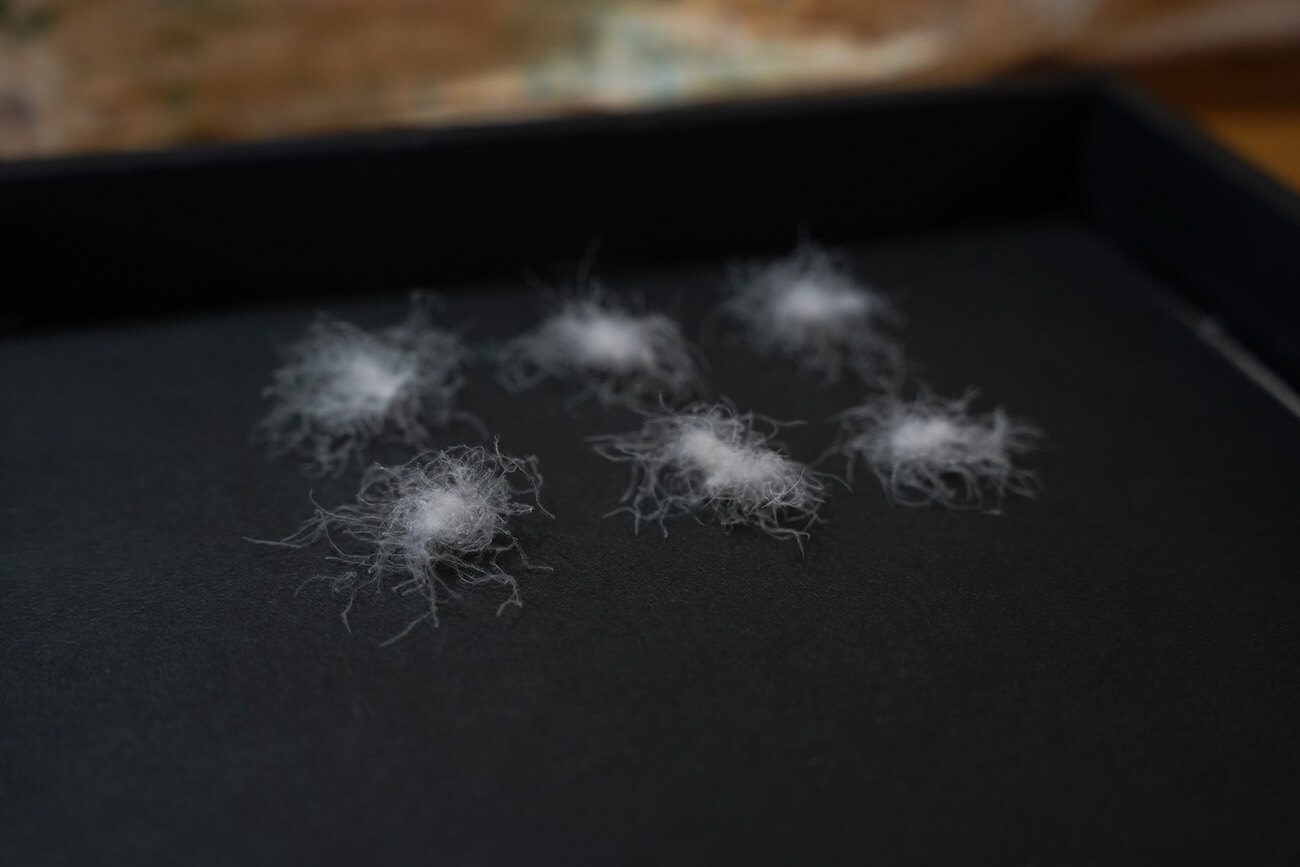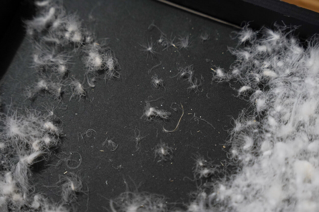 すると、小さなホコリや劣化した羽毛たちを発見しました。糸くずのように見えるのはフェザーの一部です。