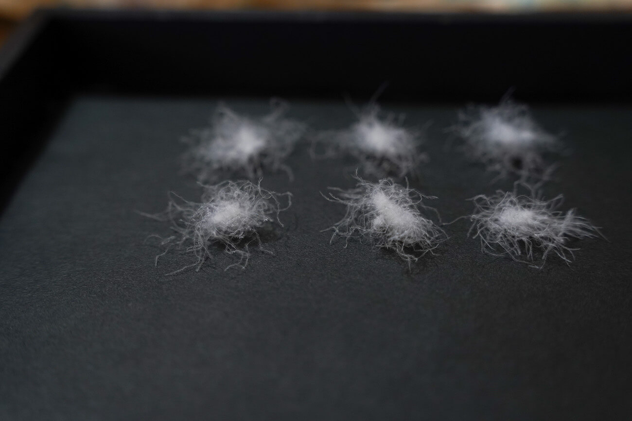 このようなホコリは羽毛布団を長らく使用しているとどうしても増えていきます。羽毛が擦れ合って小さくなったり、粉々になることでホコリのような姿になったり。このような部位は保温力が弱まっているところですので、リフォーム工程の中で丁寧に取り除いていきます。