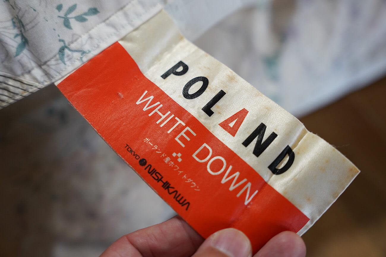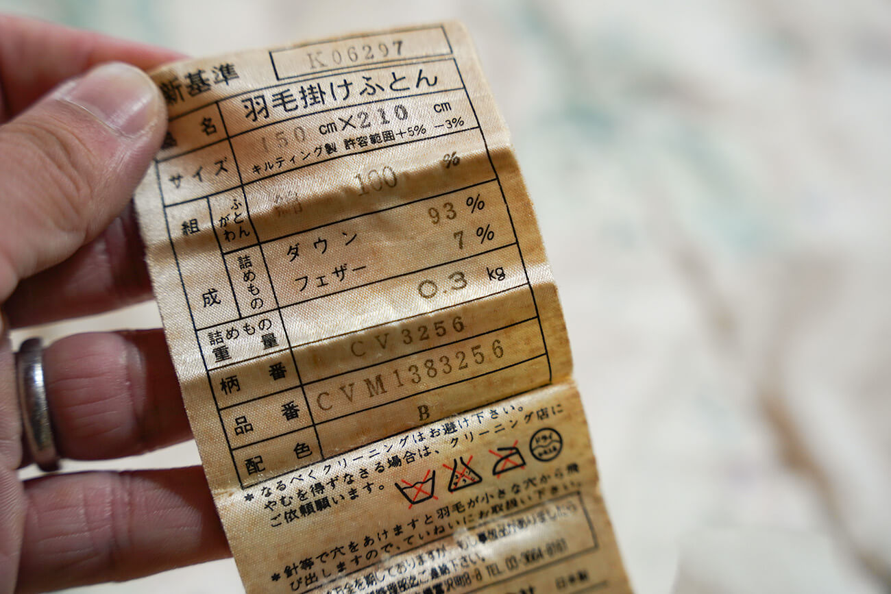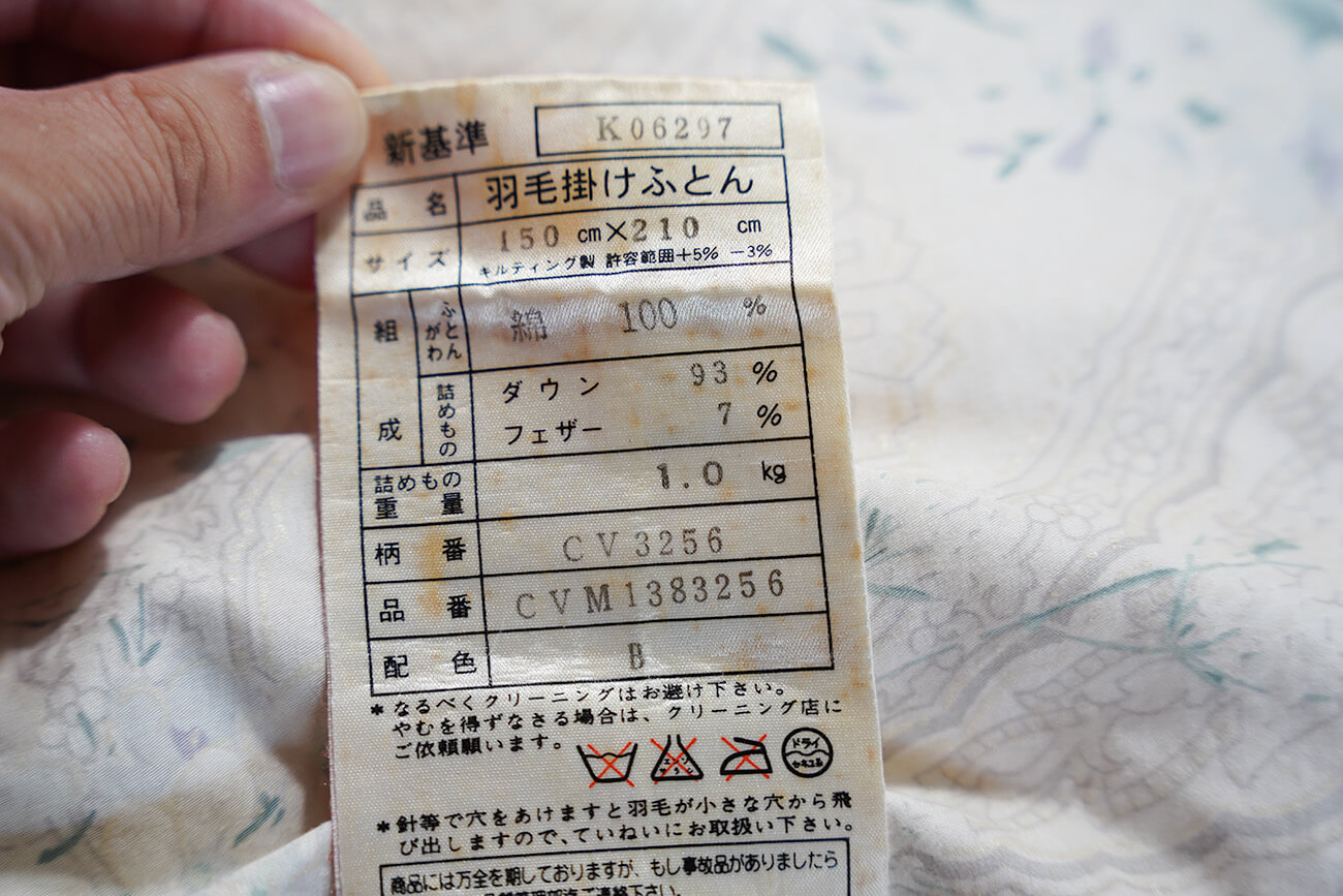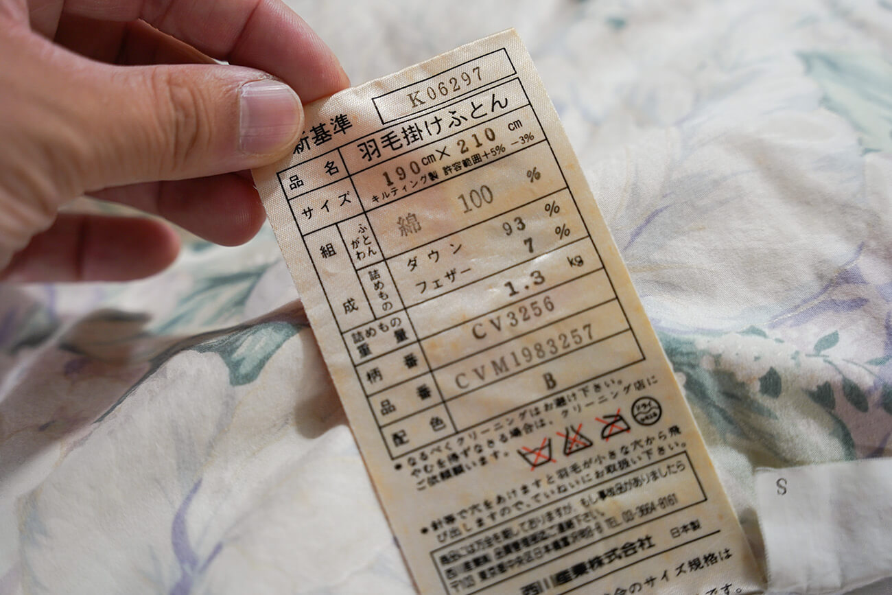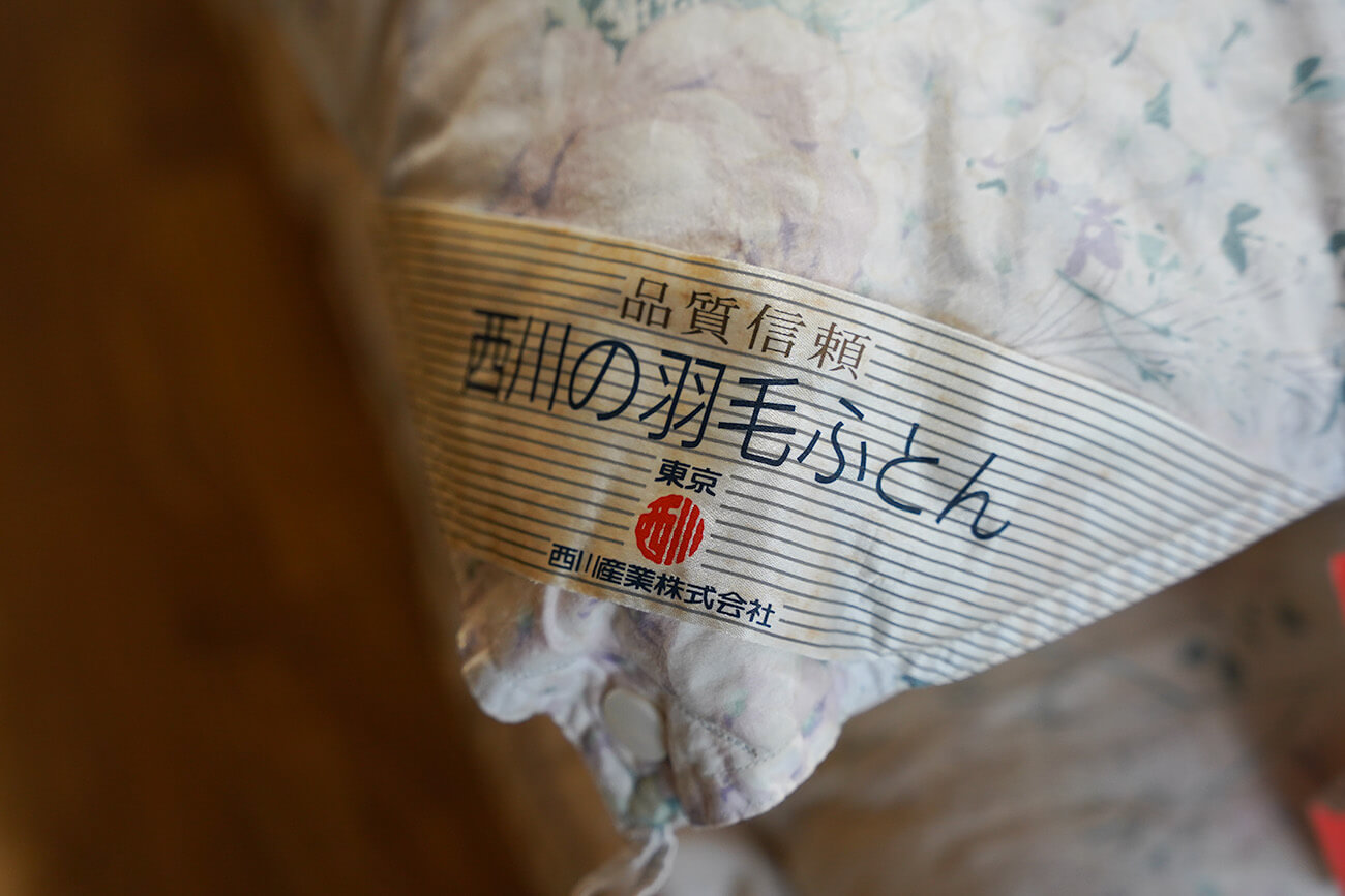 お預かりした羽毛布団のタグがこちら。西川産業=東京西川のロゴマークが見えます。