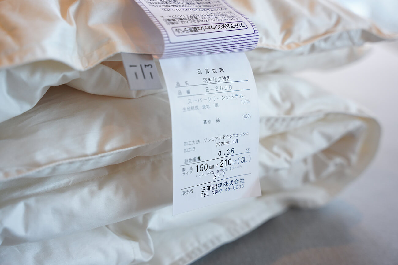 厚みのある方は800g入りとして作製。お預かりした羽毛布団よりも200g少ない仕様です。