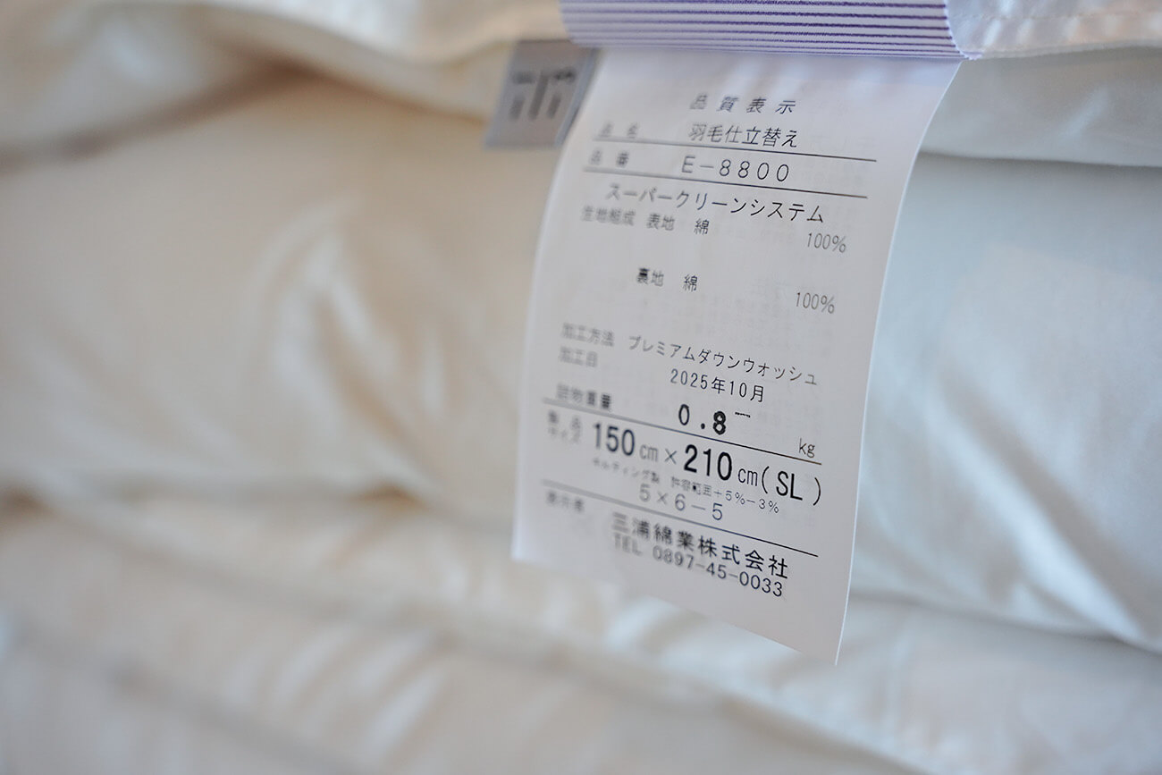 お預かりしたのは2枚合わせタイプの羽毛布団。シングルサイズは1.0g入りと、