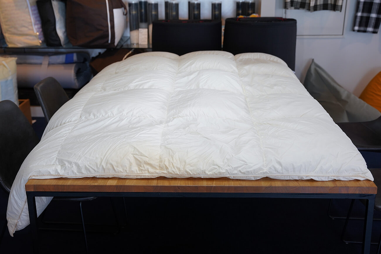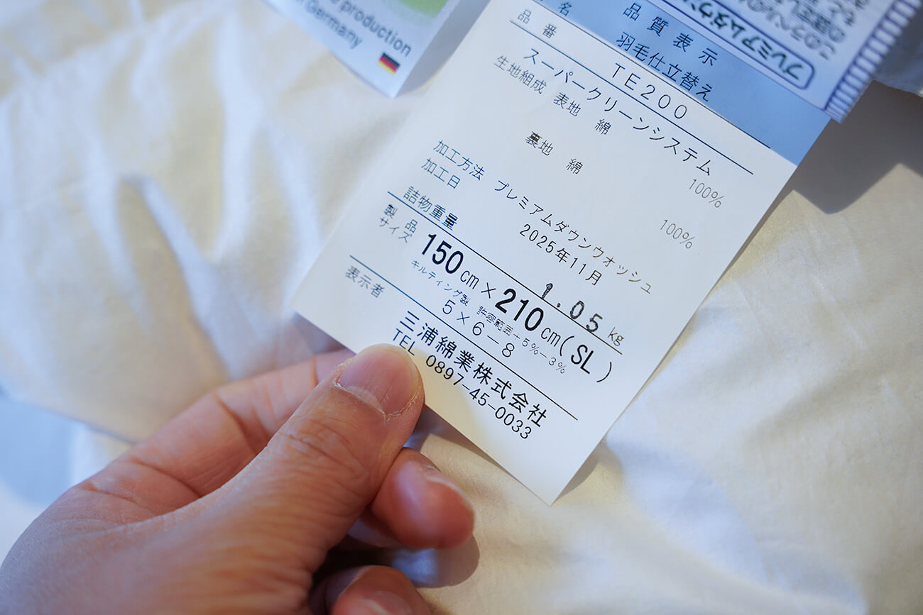 羽毛量はお預かりしたときと変わらず1,050g入りにコントロールしています。ダウナの着心地を気に入っていたからこそ、羽毛量を変えてしまっては意味がありません。
