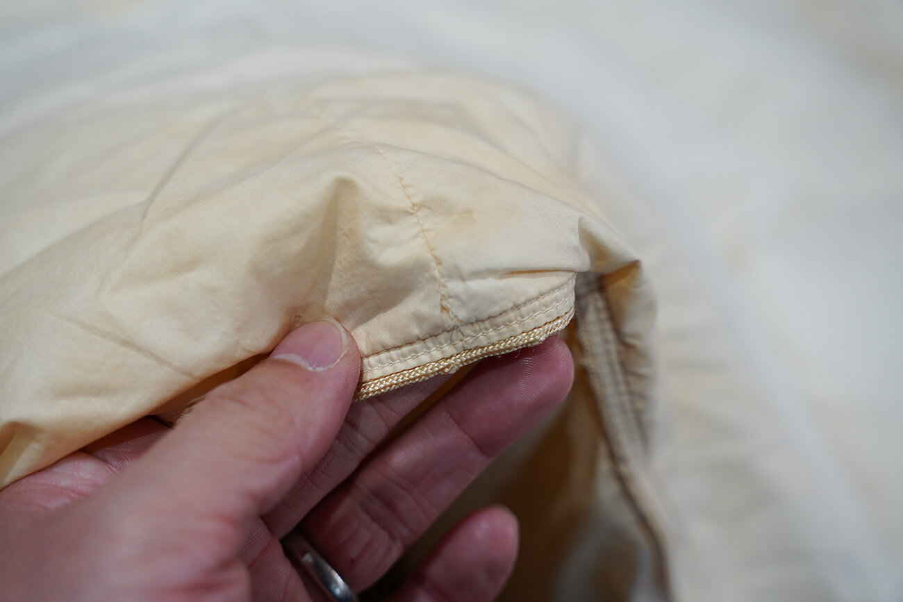ダウナをリフォームするうえで気をつけないといけないのは「側生地の種類」です。サテン織りや太い綿糸の生地を使用すると重量が重くなってしまうばかりか体にぴったりフィットする感覚が損なわれてしまいます。