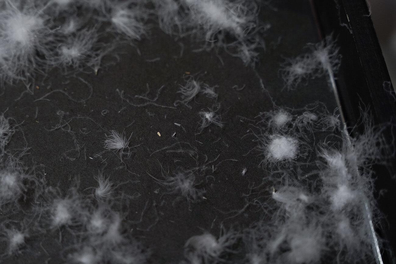 すると、小さなホコリのようなものから羽毛のちぎれたものまで、経年劣化のあとを発見いたしました。