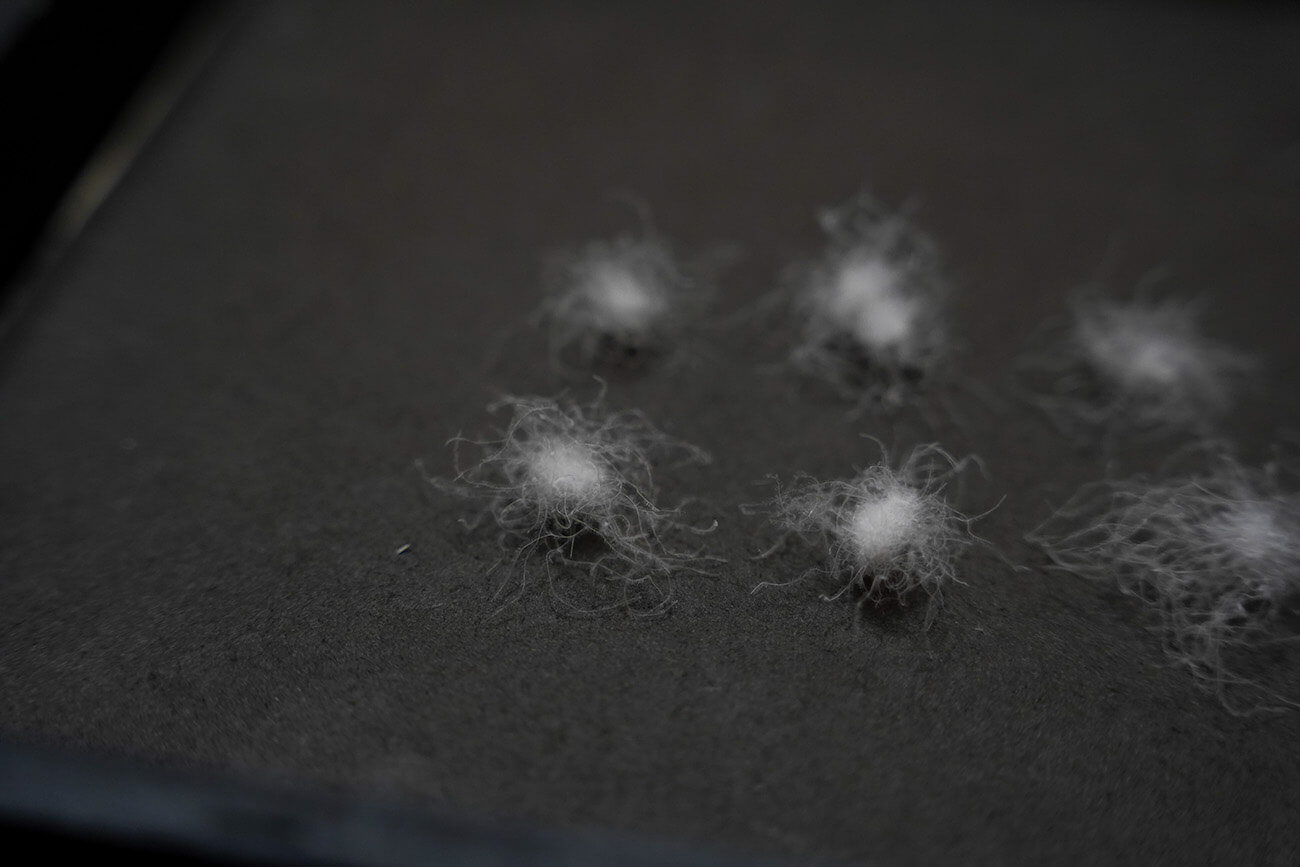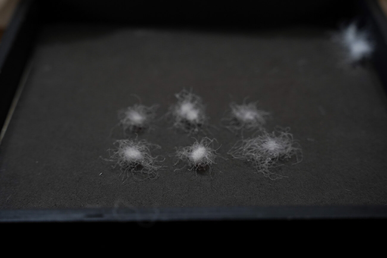 このような状態の羽毛が多くなってくると目に見えてボリューム感が少なくなったり、保温性が低く感じてきたり、生地からの吹き出しが多くなっていきます。