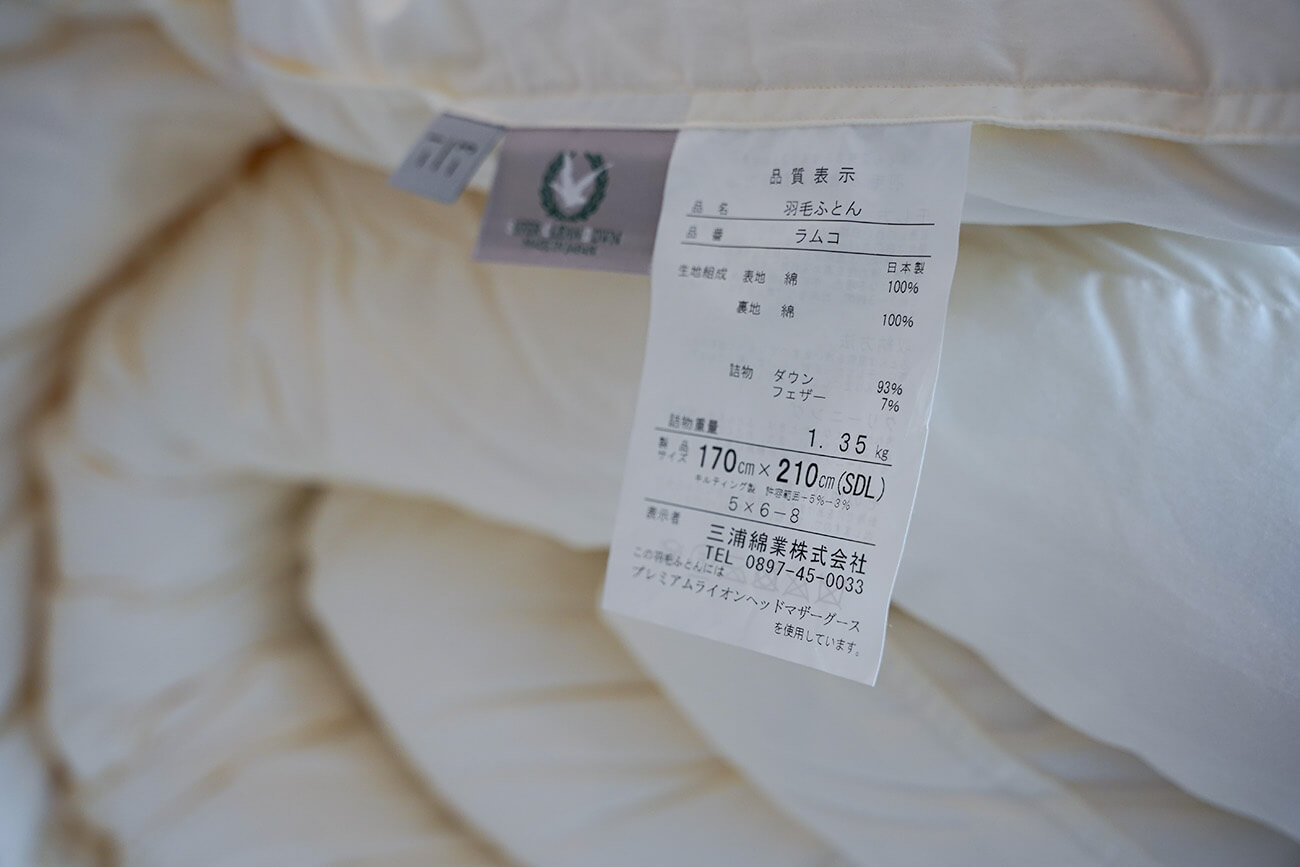セミダブルサイズの羽毛掛け布団としては中身量はやや少なめ。あえてこのg数にすることで適度な膨らみと保温性をを実現しつつ、軽くてふわっと体を包み込む着心地を楽しんでもらおうと考えました。