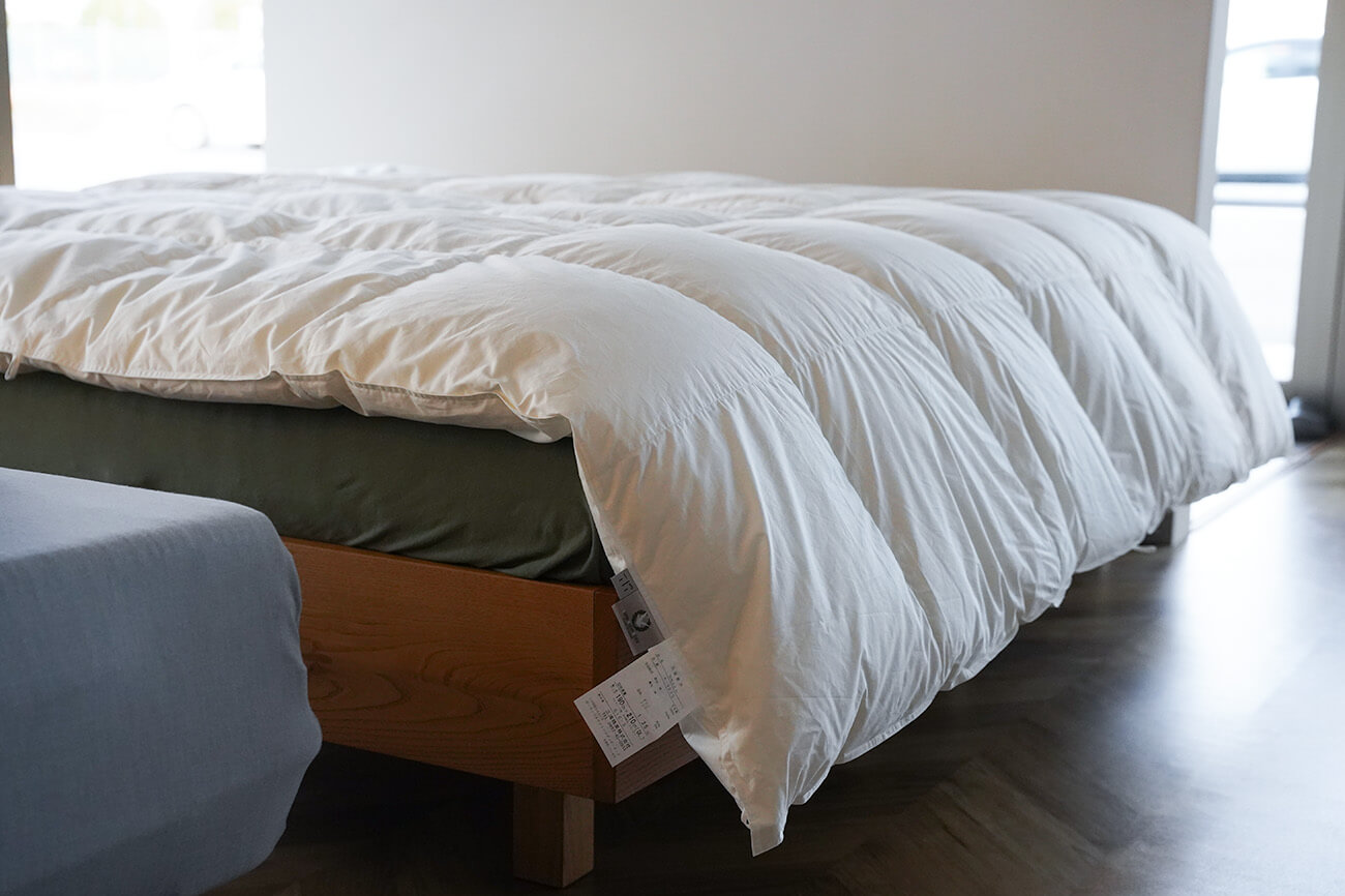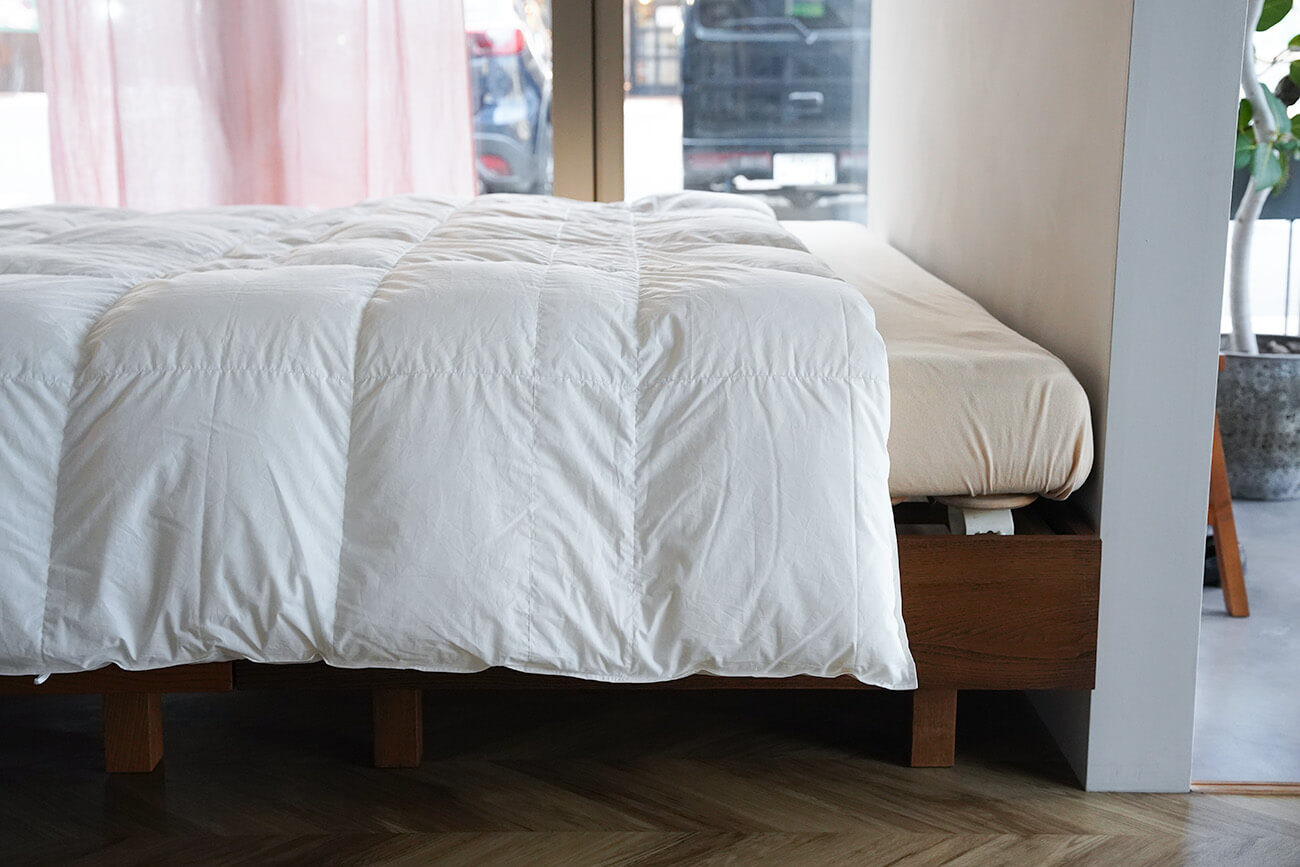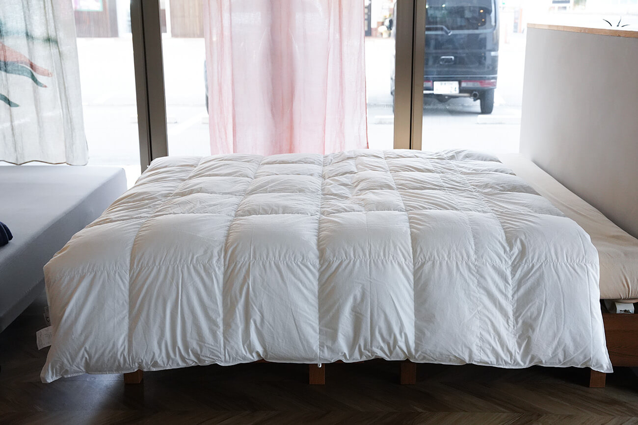 羽毛量は1,350g入りとして設定いたしました。一般的な既製品と比べると冬用にしてはかなり少なめ。ですが、これくらいにしていないと逆に暑くなってしまうかもしれません。それくらい、本当のマザーグースダウンが持つパワーと保温性は偉大です。