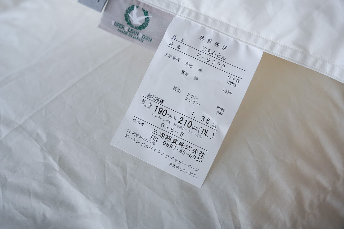 しかし、羽毛がこれ以上少なくなると奥様が寒く感じてしまうかもしれません。また、寝室のエアコンで消して寝るということもありますので、羽毛量が少なくて毛布を追加で重ねてしまったりしては元も子もない。やはり1,350gのバランスでいこうと最終的には結論を出しました。